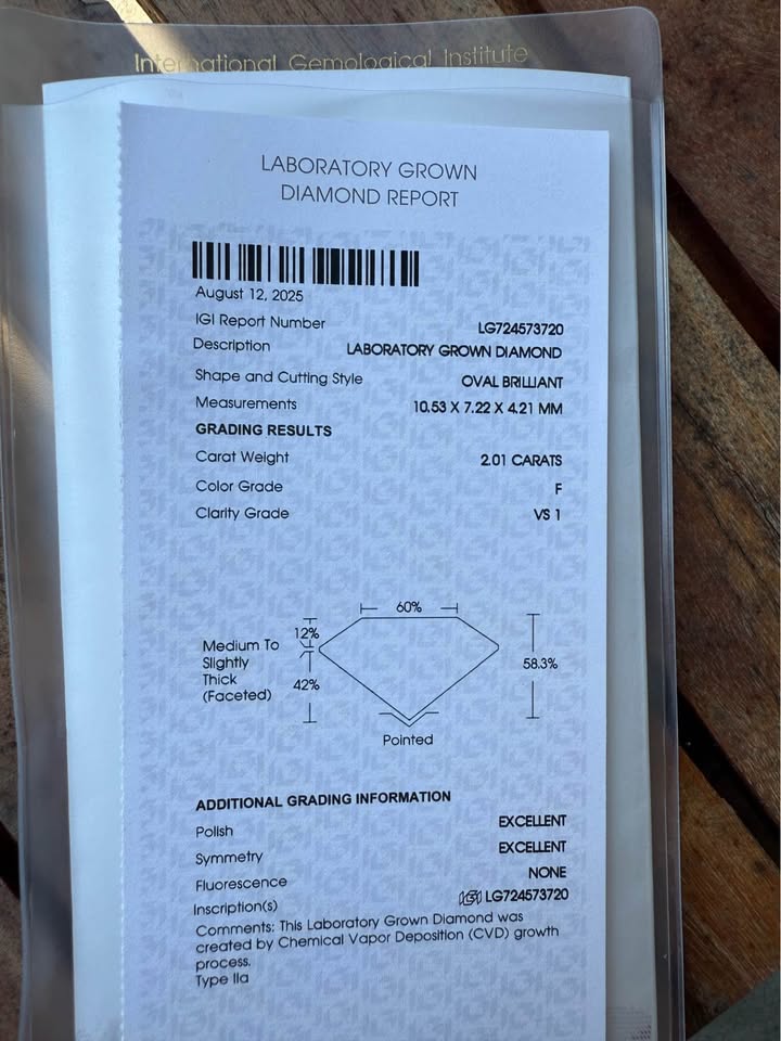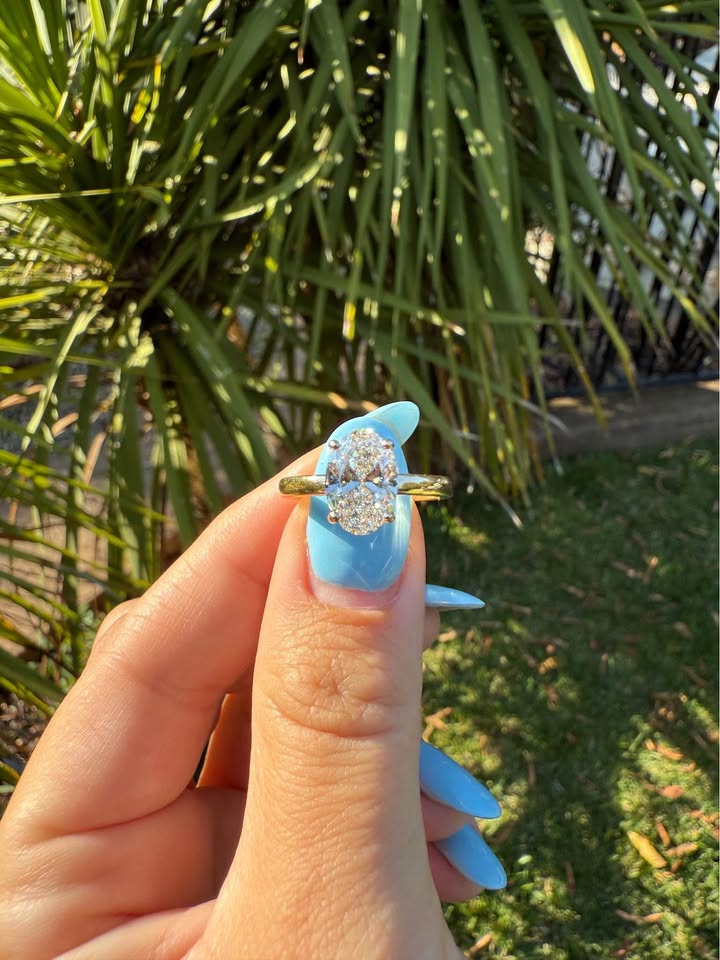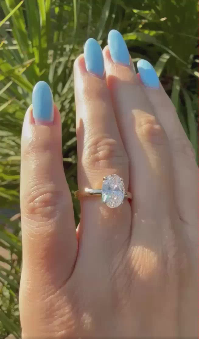 Beautiful 2 carat oval cut F VS1 lab-grown diamond, set in classic 14k yellow gold with a hidden halo for extra sparkle and elegance.