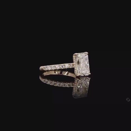 3 carat e vvs2 radiant on a 14k yellow gold half carat diamond band with diamond hidden halo