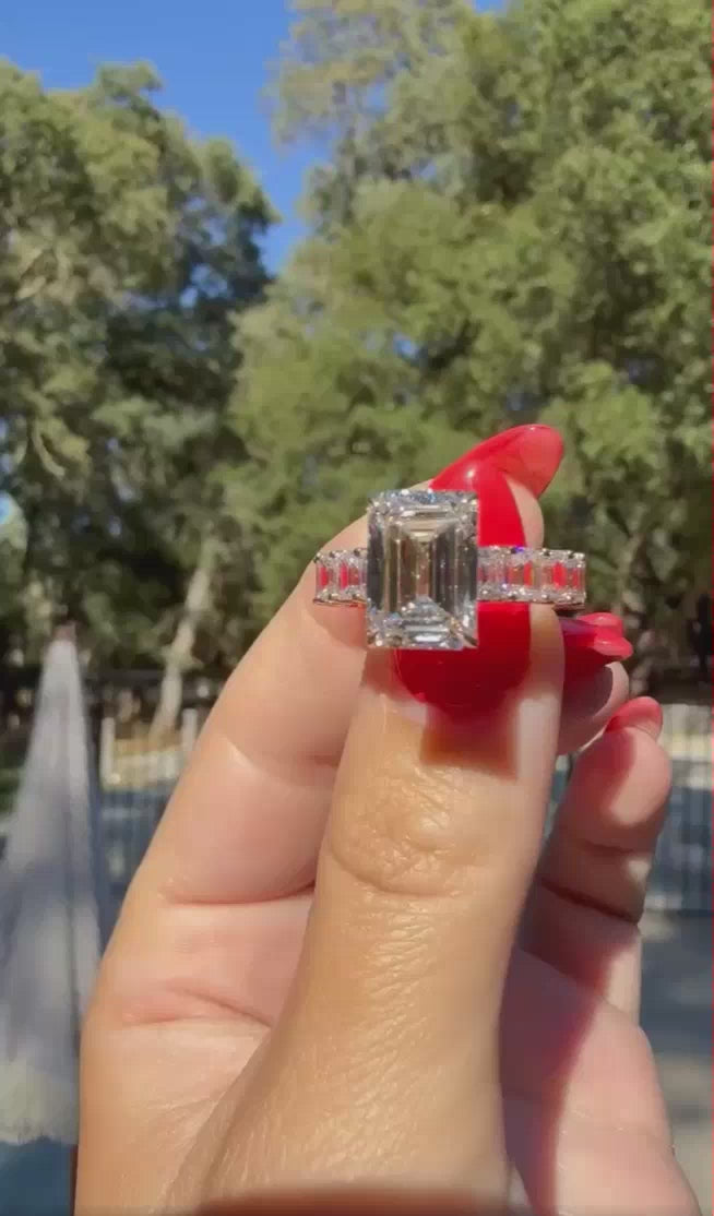 This beautiful 9.90 carat Emerald Diamond Ring features a 4.90 carat lab grown center stone with 5 carat band - F color, VVS2 clarity, set in 18k yellow gold (size 7)